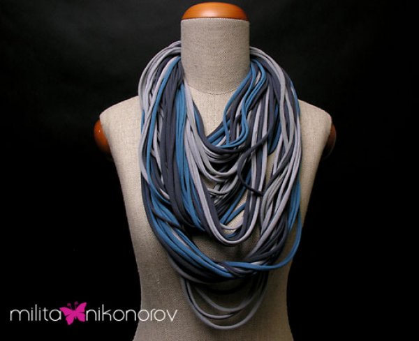 Oryginalny, designerski naszyjnik - szal, wykonany z pasów dzianiny w kolorze ciemno-turkusowym, grafitowym i szarym. Można go nosić jak szalik lub używać jako element stylizacji. Możliwość zamówienia naszyjnika w innym kolorze. Proszę o wcześniejszy kontakt