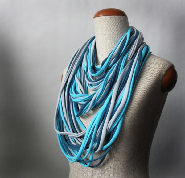 Oryginalny, designerski naszyjnik - szal, wykonany z pasów dzianiny w odcieniach koloru turkusowego i szarości. Można go nosić jak szalik lub używać jako element stylizacji. Możliwość zamówienia naszyjnika w innym kolorze. Proszę o wcześniejszy kontakt