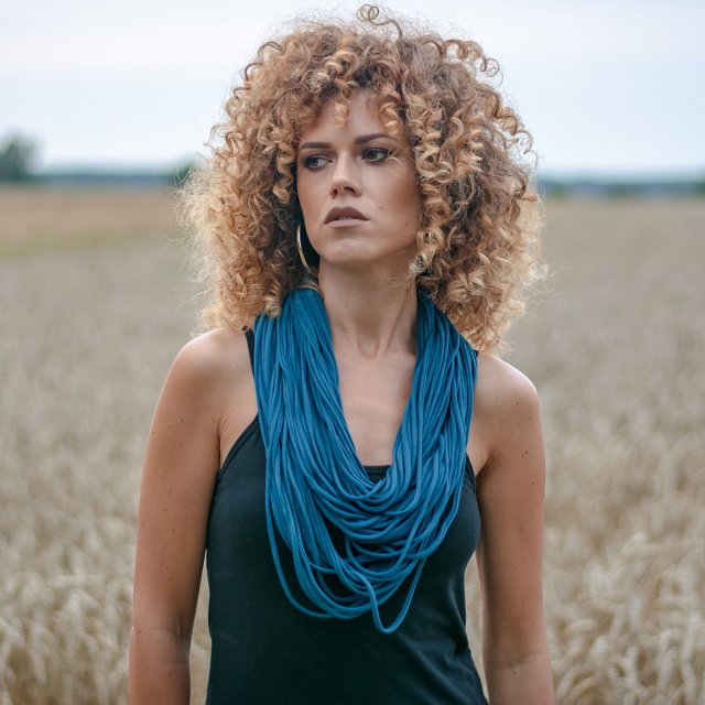 wykonany z pasów dzianiny w kolorze ciemnego turkusu.