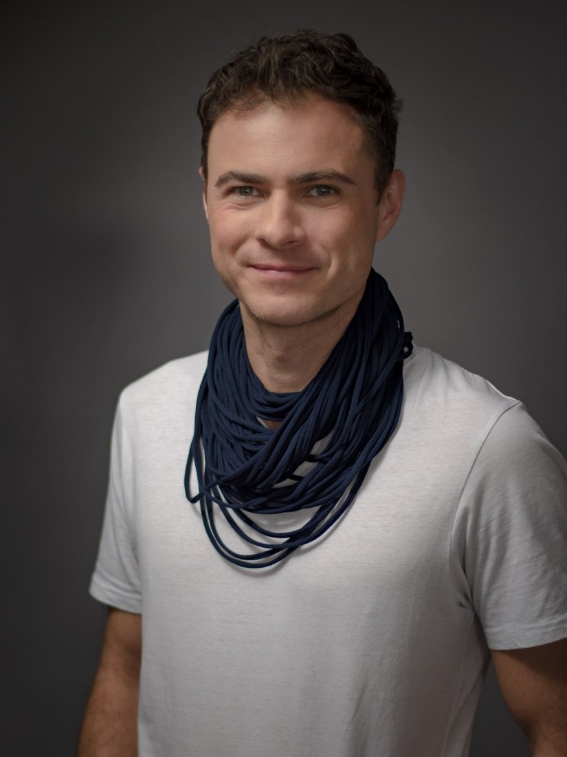 Niezwykle oryginalny, designerski naszyjnik - szal, wykonany z pasów dzianiny w kolorze ciemnego granatu. Można go nosić jak szalik lub używać jako element stylizacji. Możliwość zamówienia naszyjnika w innym kolorze. Proszę o wcześniejszy kontakt.
