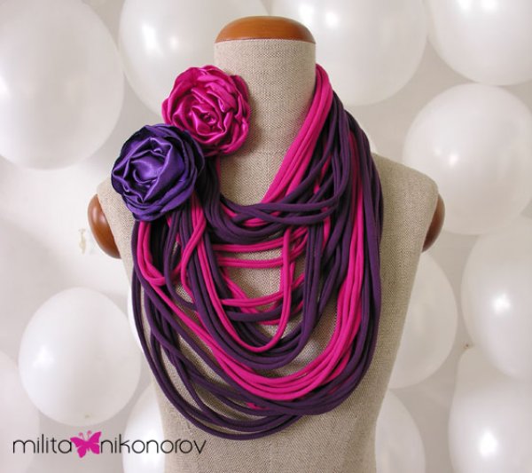 Niezwykle oryginalny, designerski naszyjnik - szal, wykonany z pasów dzianiny w kolorze fioletowym i fuksjowym. W komplecie z 2 ręcznie wykonanymi broszkami w kolorze fioletu i fuksji. Można go nosić jak szalik lub używać jako element stylizacji. Końcówki dzianinowych pasów zszyte ze sobą. Możliwość zamówienia naszyjnika w innym kolorze. Proszę o wcześniejszy kontakt