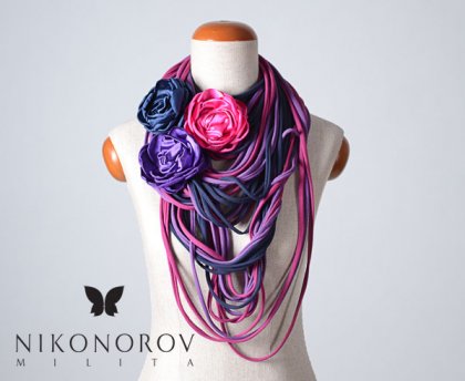 Niezwykle oryginalny, designerski naszyjnik - szal, wykonany z pasów dzianiny w kolorach: fiolet, amarant i granatowy. W komplecie z 3 ręcznie wykonanymi broszkami w kolorach pasujących do naszyjnika. Można go nosić jak szalik lub używać jako element stylizacji. Możliwość zamówienia naszyjnika w innym kolorze. Proszę o wcześniejszy kontakt
