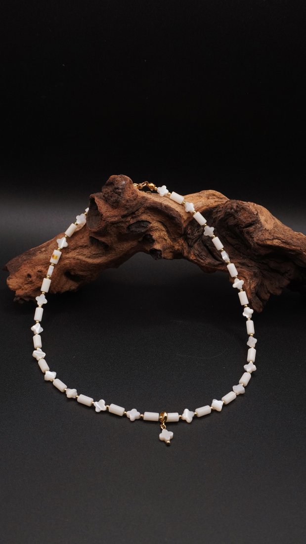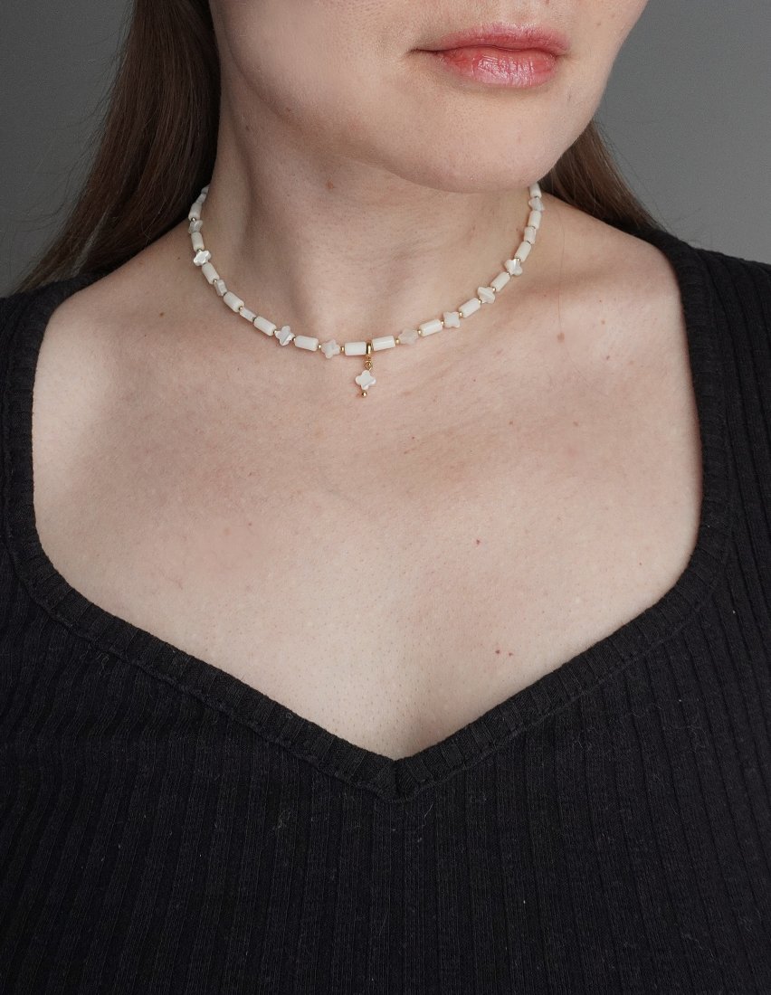 Odkryj subtelność zamkniętą w naturalnych materiałach. Ten wyjątkowy, ręcznie wykonany naszyjnik to harmonijne połączenie klasycznej bieli i kremowych odcieni, które rozświetlą każdą stylizację.