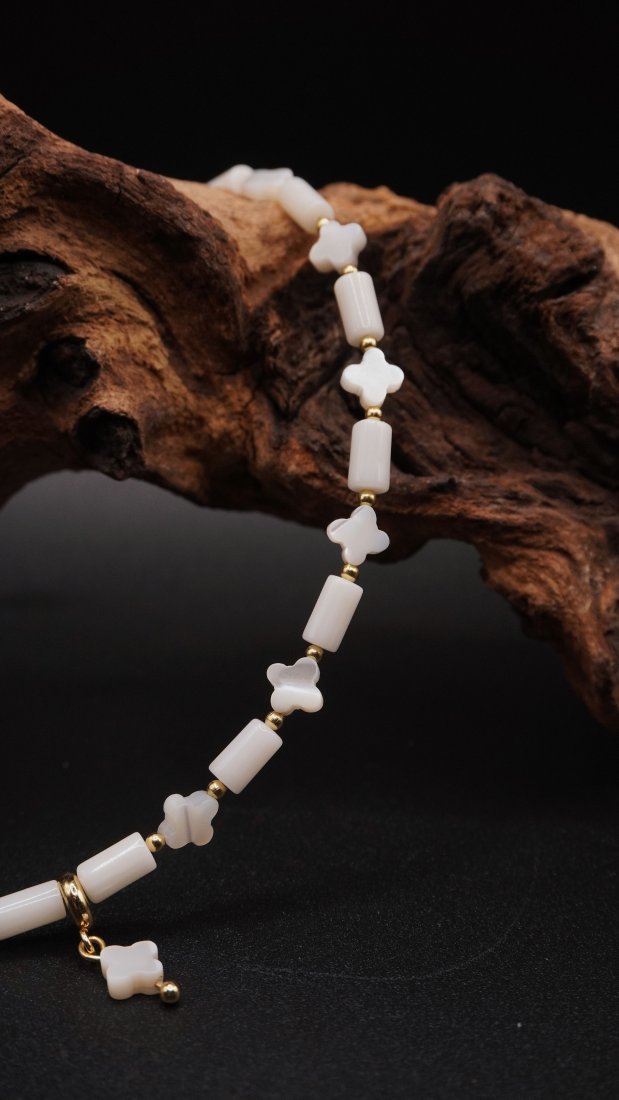 Głównym elementem kompozycji są gładkie, cylindryczne paciorki białego koralu, przeplatane urokliwymi koralikami z masy perłowej (muszli) w kształcie delikatnych kwiatuszków. Całość wieńczy subtelna zawieszka, która nadaje biżuterii lekkości i dziewczęcego uroku.