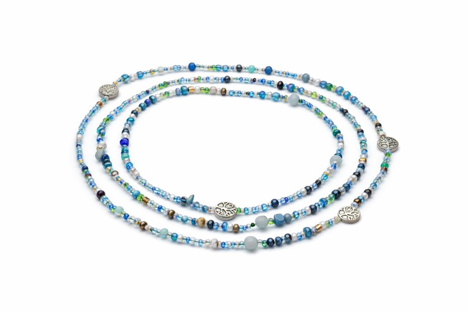 Paleta barw: Dominują tu odcienie turkusu, morskiej zieleni i głębokiego błękitu, przeplatane mniejszymi koralikami w kolorze białym, srebrnym i piaskowym. To zestawienie kojarzy się z kolorami oceanu lub lasu po deszczu.