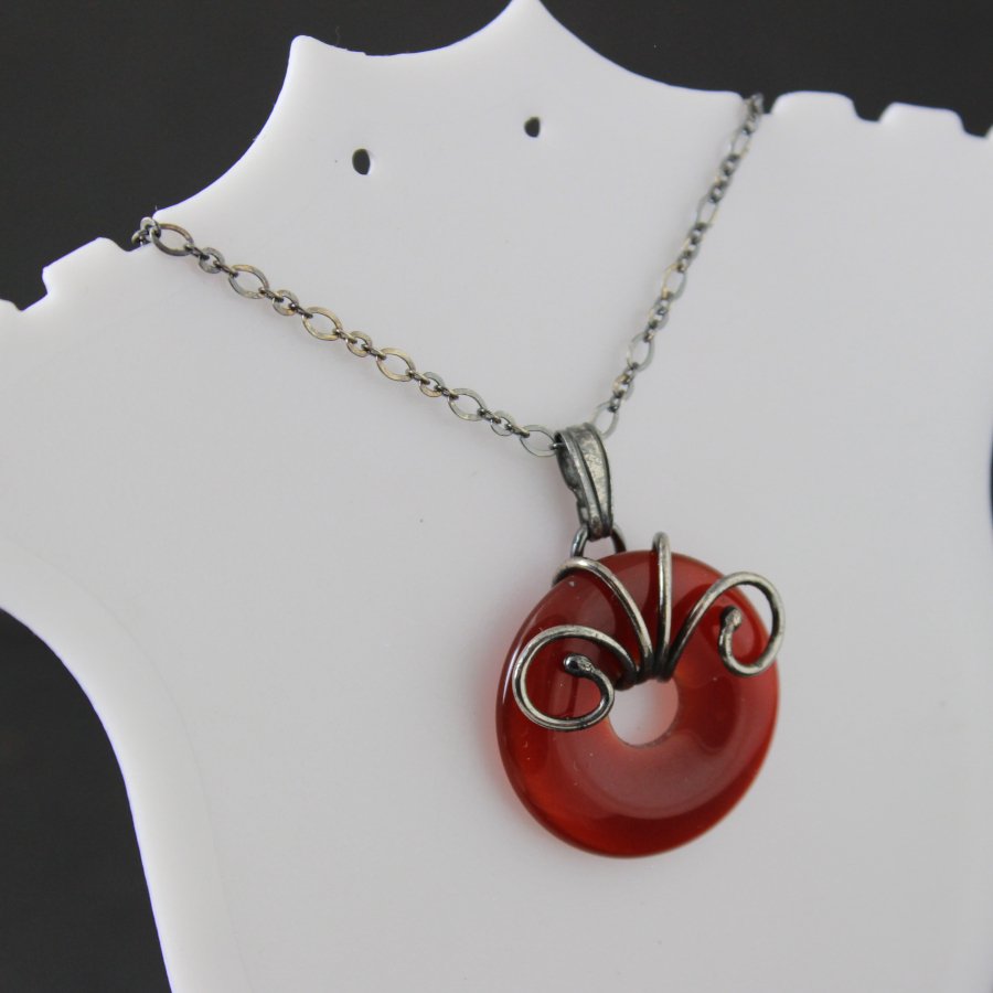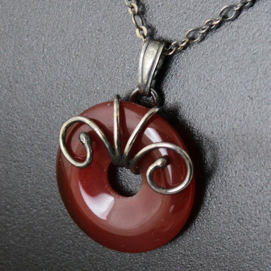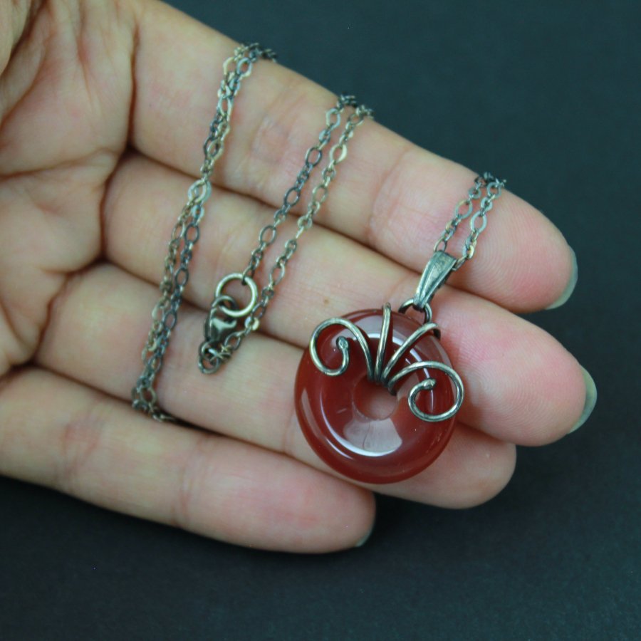 Całość mierzy 3,2 cm długości i 2,3 cm szerokości, łańcuszek w obwodzie ma około 55 cm. To jedyny taki egzemplarz – uformowany ręcznie, z uważnością w każdym detalu: od kształtowania drutu, przez osadzenie kamienia, po oksydowanie i polerowanie. Karneol, kamień odwagi i wewnętrznego ognia, ma wzmacniać witalność i przypominać o sile ukrytej w spokoju.