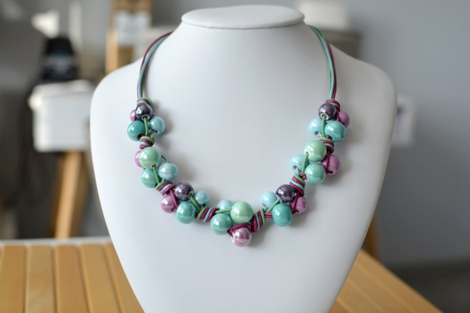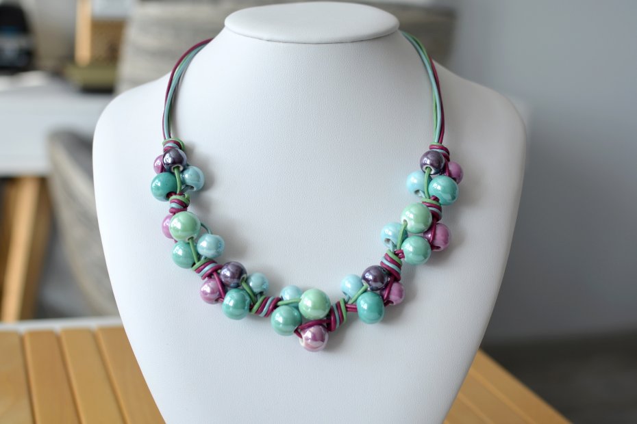 Naszyjnik wykonany z naturalnych lakierowanych, okrągłych rzemieni skórzanych oraz kulek ceramicznych o średnicy od 10 do 16 mm w odcieniach fioletu, pistacji, gołębiego błękitu i turkusu.