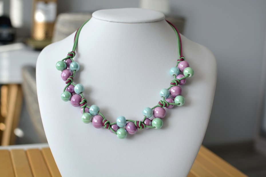 Naszyjnik wykonany z kulek ceramicznych w odcieniach lawendy, pistacji i delikatnego gołębiego niebieskiego, a także z okrągłych, barwionych rzemieni skórzanych. Ceramiczne kule mają średnicę od 10 do 14mm.