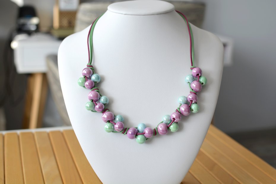 Naszyjnik wykonany z kulek ceramicznych w odcieniach lawendy, pistacji i delikatnego gołębiego niebieskiego, a także z okrągłych, barwionych rzemieni skórzanych. Ceramiczne kule mają średnicę od 10 do 14mm.