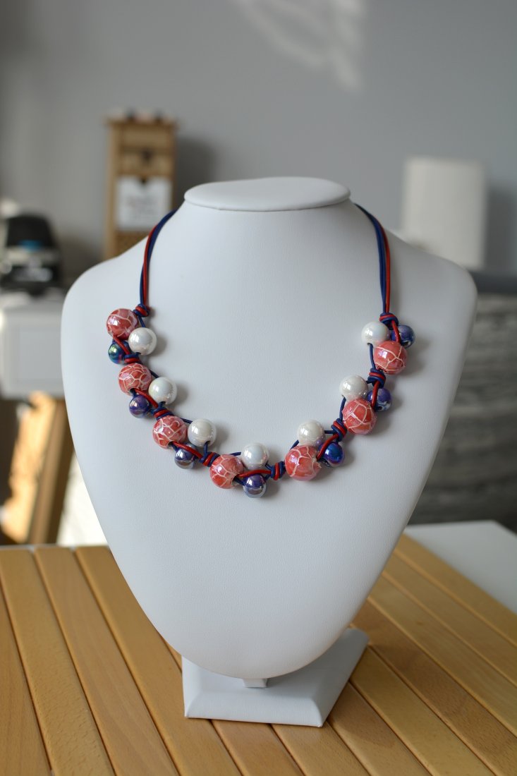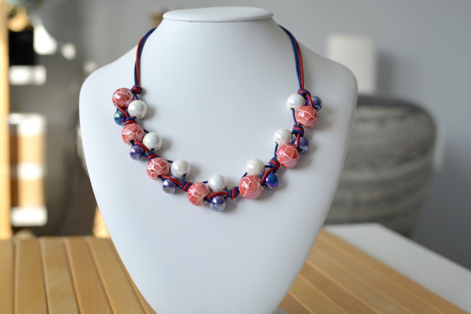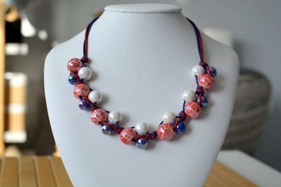 Naszyjnik wykonany z naturalnych, okrągłych rzemieni skórzanych oraz kulek ceramicznych o średnicy od 12 do 16mm, w kolorystyce granatowo-czerwono-białej. Największe kule ceramiczne pokryte są szkliwem z efektem spękania, najmniejsze - kobaltowe z efektem benzyny.