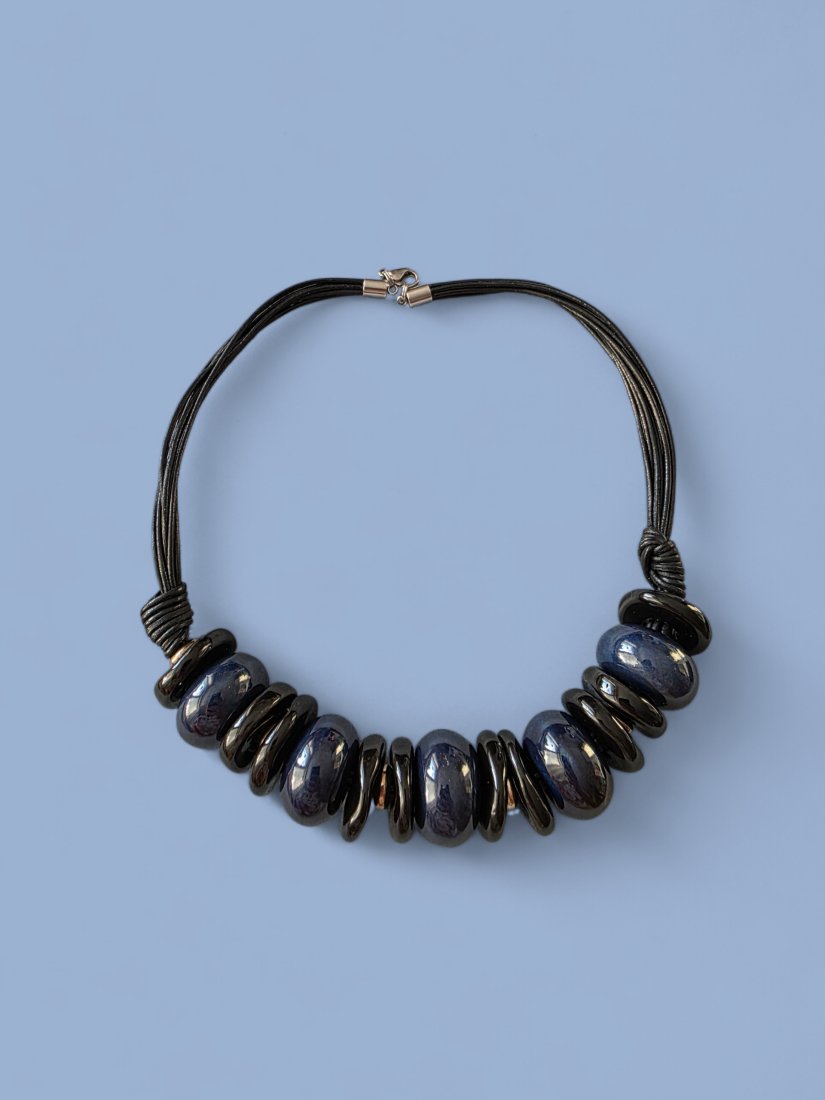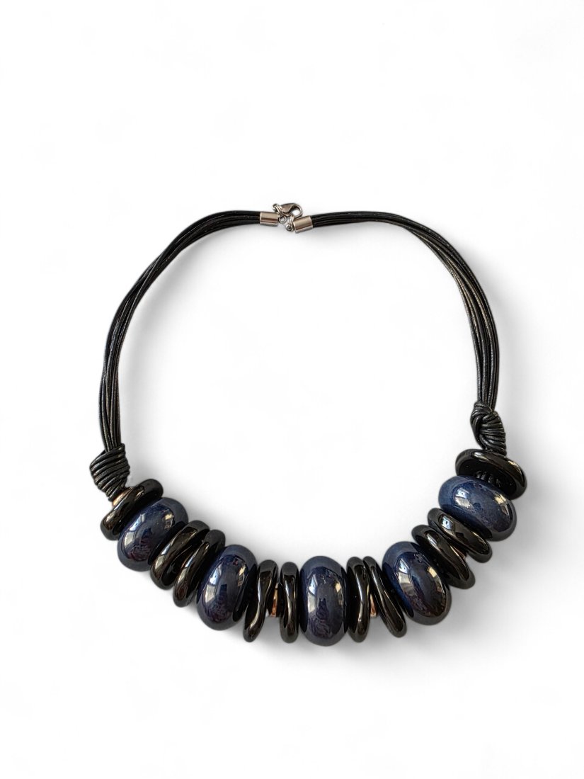 Naszyjnik wykonany jest z elementów ceramicznych (oponek o śr. 22mm w kolorze granatowym i dysków o śr. ok. 20mm w kolorze czarnym} nałożonych na rzemienie skórzane w kolorze czarnym.