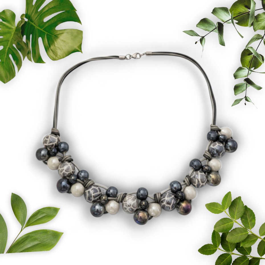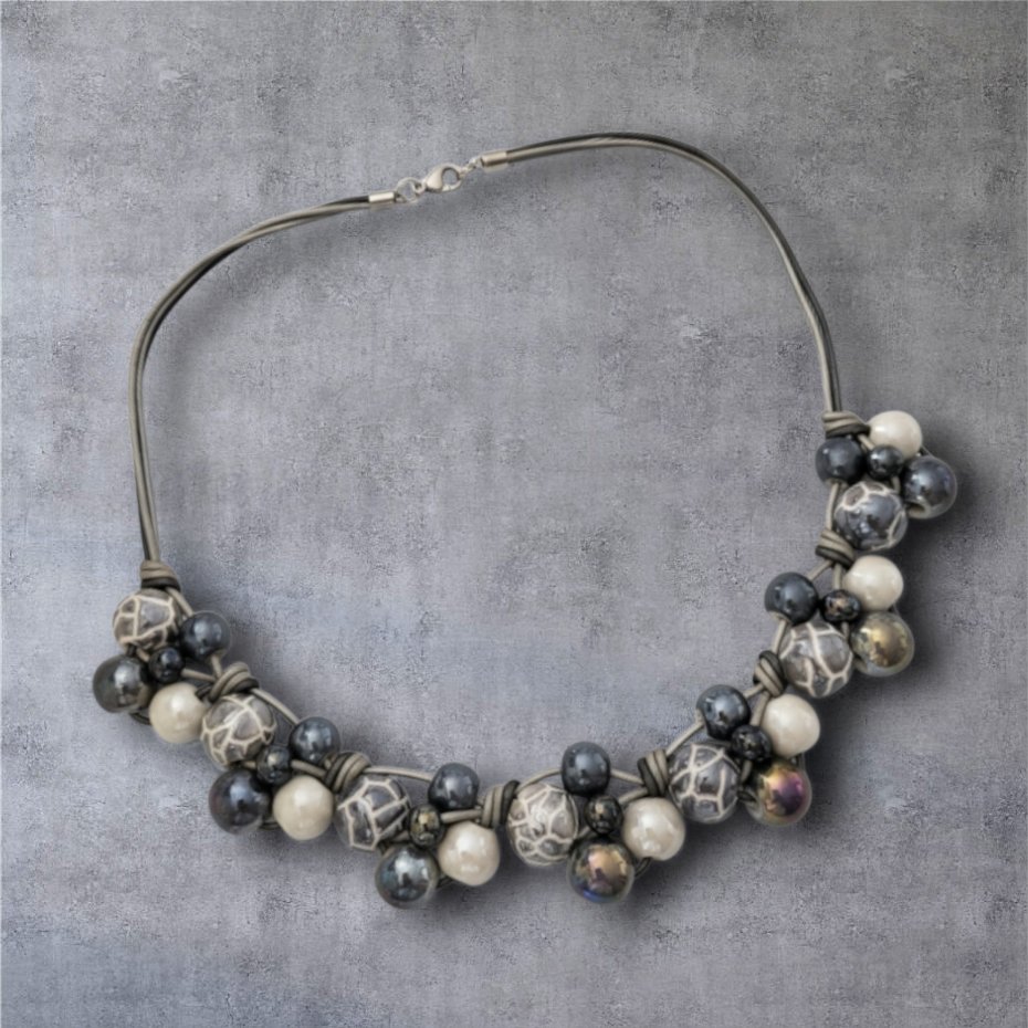 Naszyjnik wykonany z naturalnych, okrągłych rzemieni skórzanych oraz kulek ceramicznych o średnicy od 8 do 16 mm, w kolorystyce szaro-grafitowej. Kulki ceramiczne o największej średnicy pokryte są szkliwem z efektem spękania.