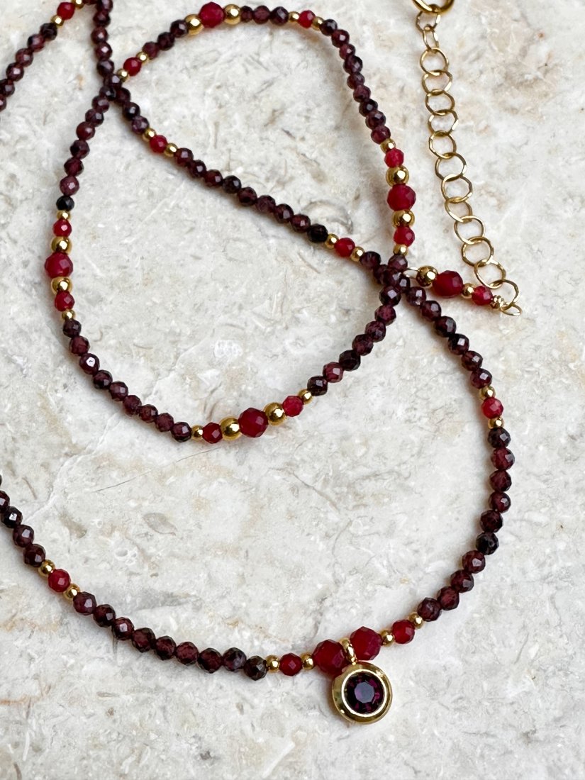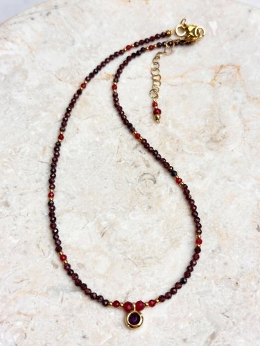 Minimalistyczny ręcznie robiony naszyjnik z delikatnych kamieni naturalnych: granatu w kolorze bordowym oraz chalcedonu w kolorze głębokiego czerwonego wina.