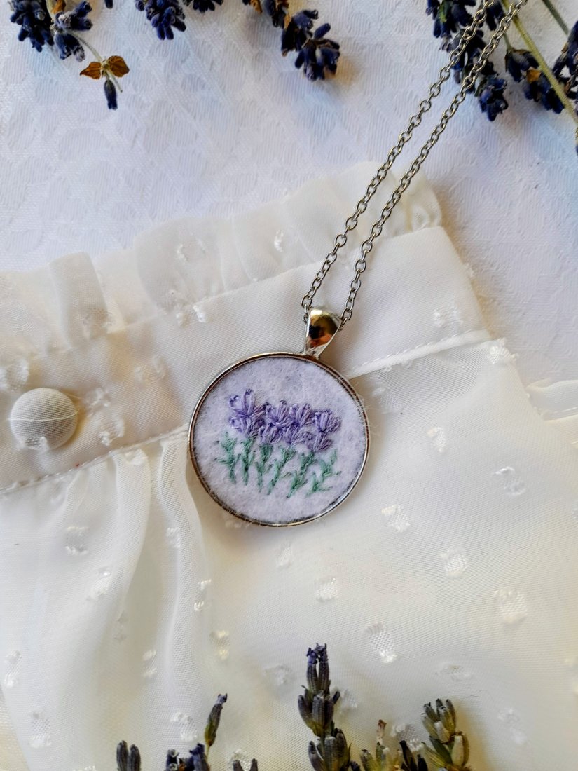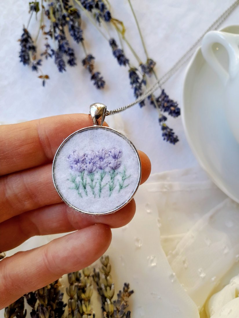 Delikatny, haftowany ręcznie naszyjnik z jasnofioletowymi gałązkami lawendy na białym tle. To jak słoneczny poranek z lawendowym zapachem w tle. Ucieszy wielbicielki kwiatowych romantycznych stylizacji.