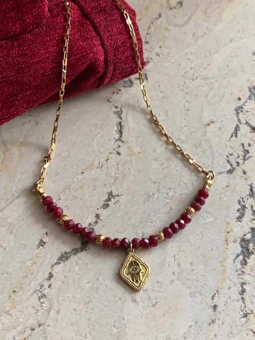 Naszyjnik wykonany częściowo z kamieni naturalnych - jadeitów w odcieniu bordo oraz krótkiego łańcuszka. Całość zwieńcza stalowa zawieszka z Ręką Fatimy.