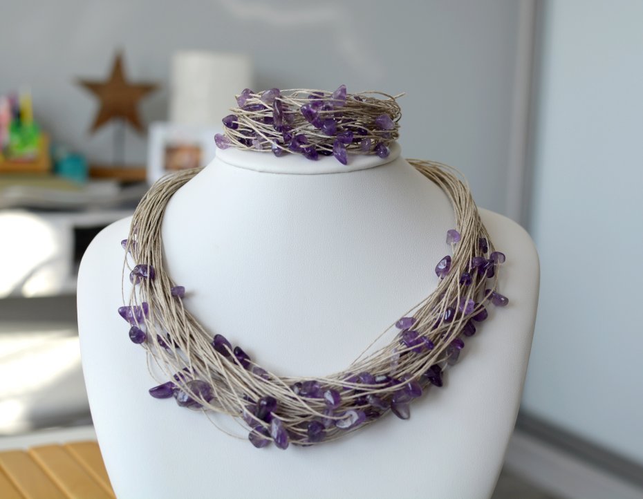 Tagi: #ametysty, #kamienie półszlachetne na lnie, #lniany naszyjnik z bransoletką