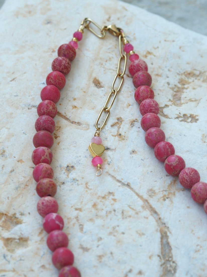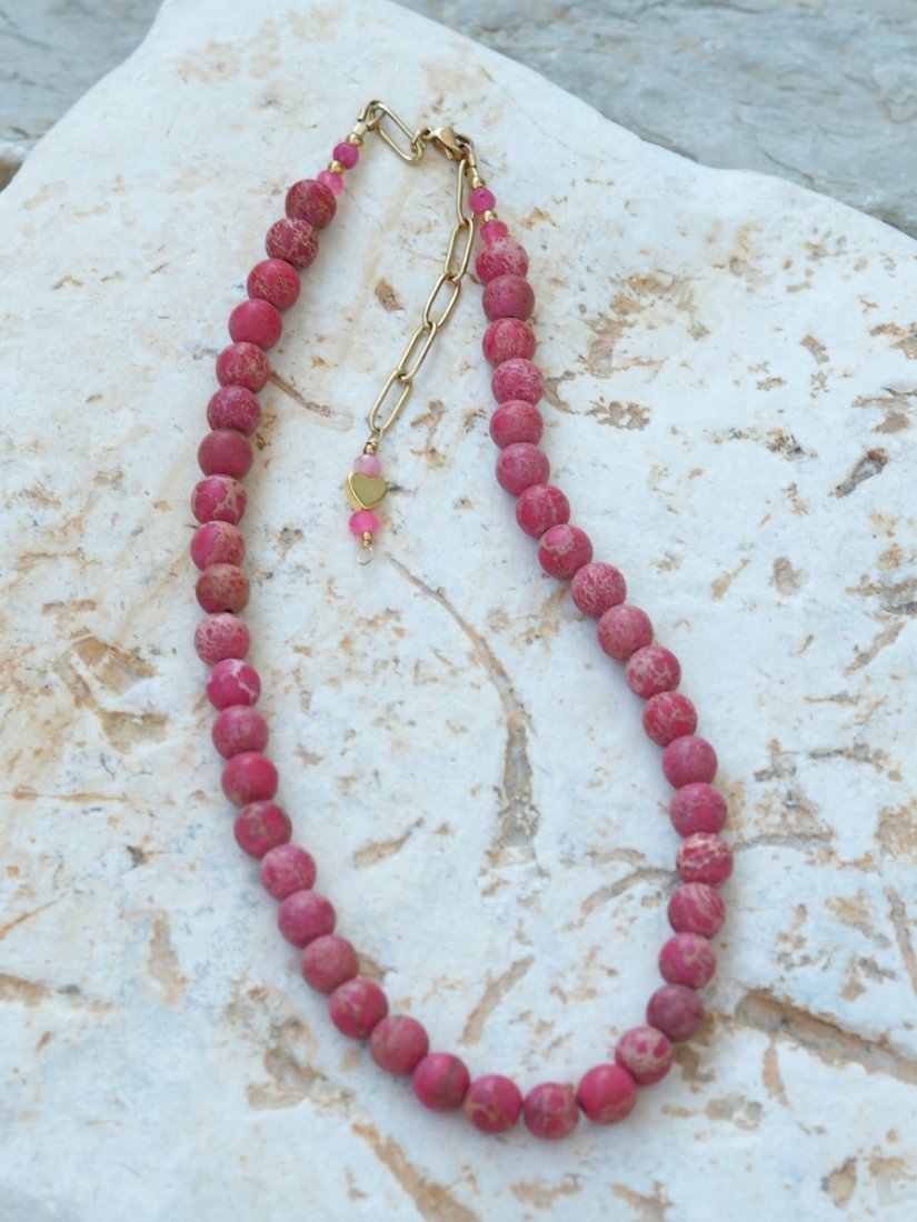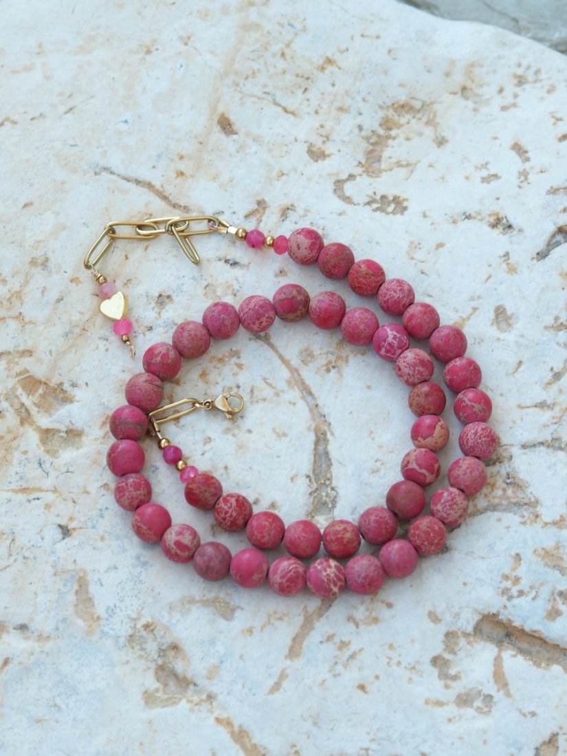 Naszyjnik z kamienia Jaspis Cesarski to podróż przez kolory natury – od mięty i turkusu, po odcienie różu, piasku i brązu. Każdy koralik ma swój własny rysunek, jakby zamknięto w nim fragment pejzażu – dlatego każdy naszyjnik jest absolutnie niepowtarzalny.