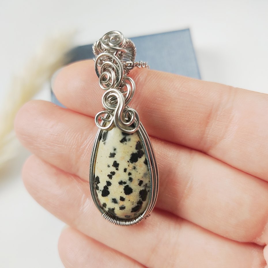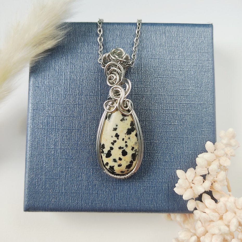 Naszyjnik Jaspis Dalmatyński ręcznie robiony. Wykonany techniką wire wrapping z drutów ze stali chirurgicznej.
