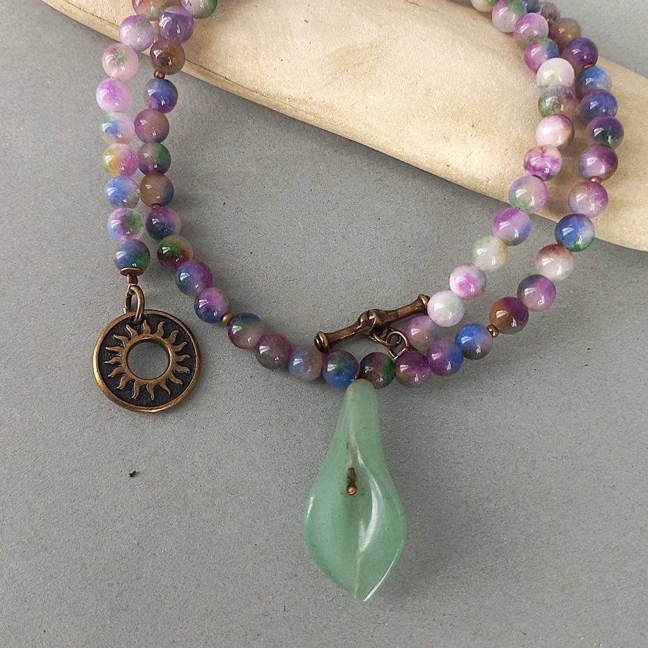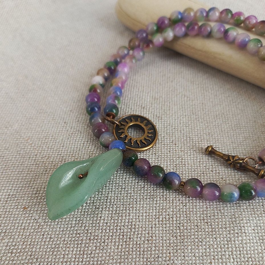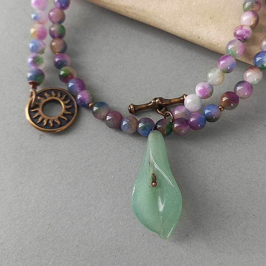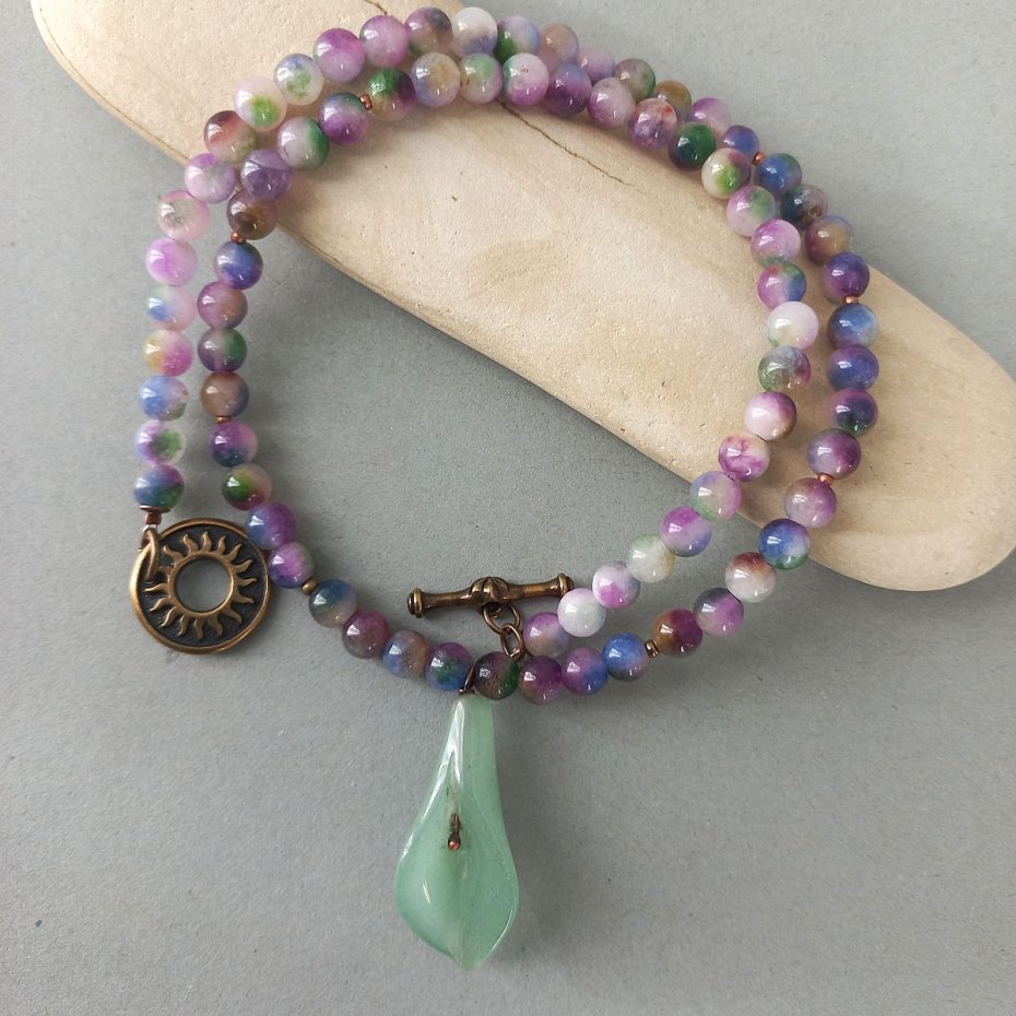 Kalia wyszlifowana z naturalnego jadeitu - duży, efektowny wisiorek o wymiarach: 3,6 x 1,6 x 1,5 cm. Tło stanowią kulki chalcedonu.