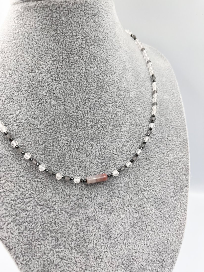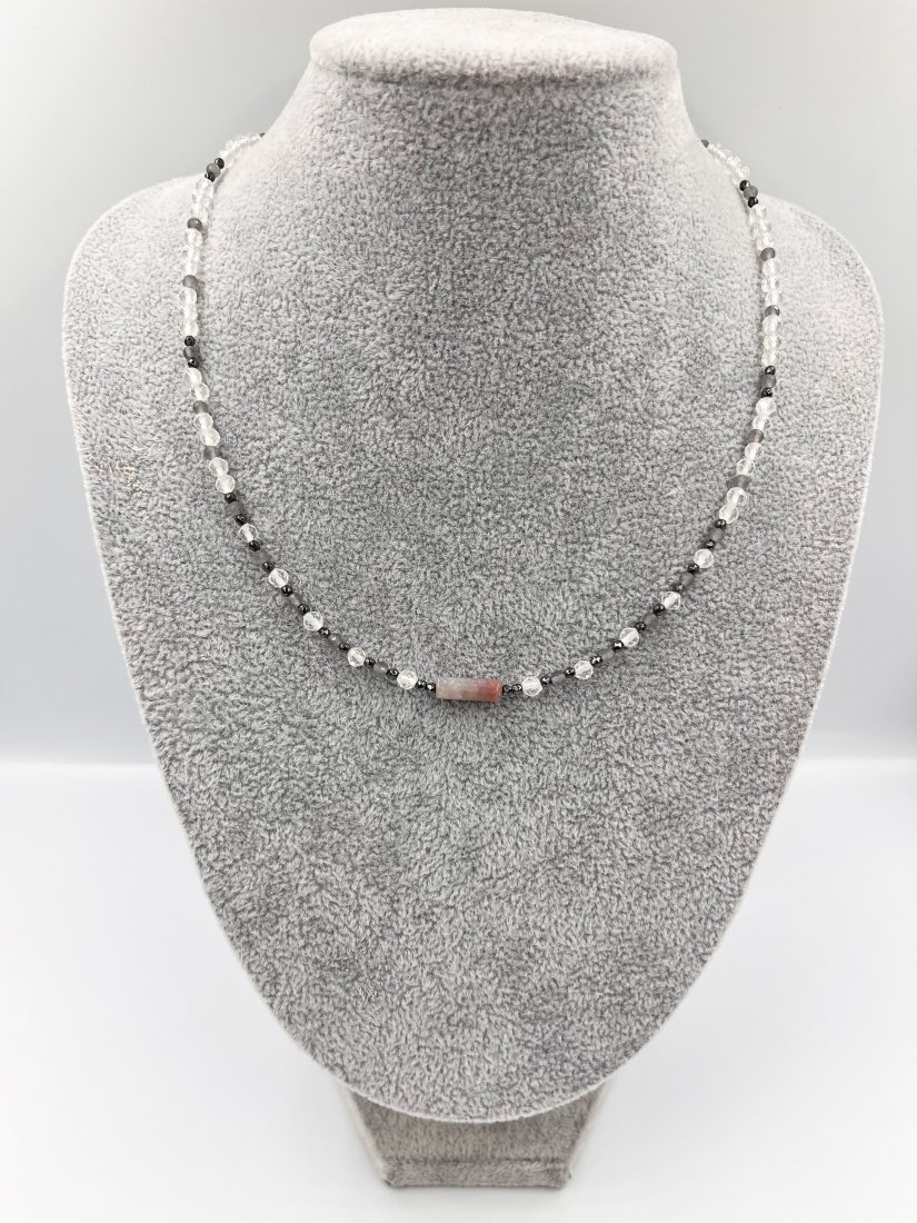 Delikatny naszyjnik z kamienia księżycowego i labradorytu przepleciony przepięknym grafitowym hematytem. W samym centrum naszyjnika walec z jadeitu w delikatnych odcieniach - w tym przebijający róż.