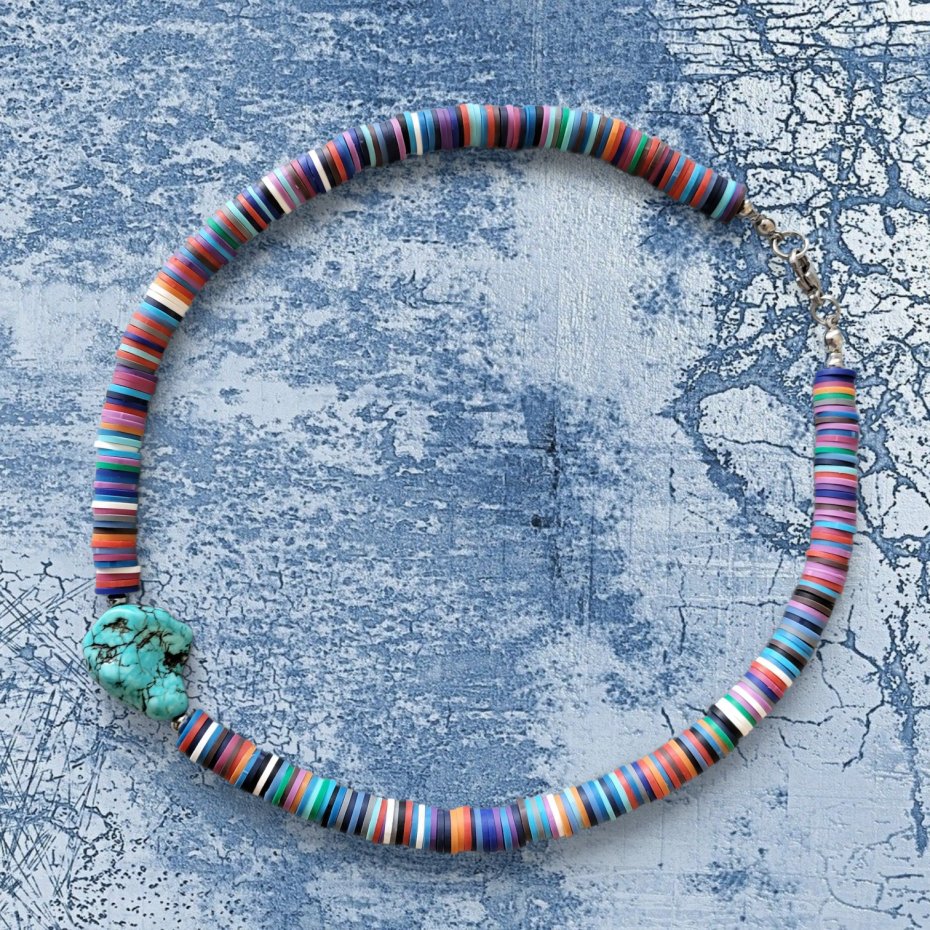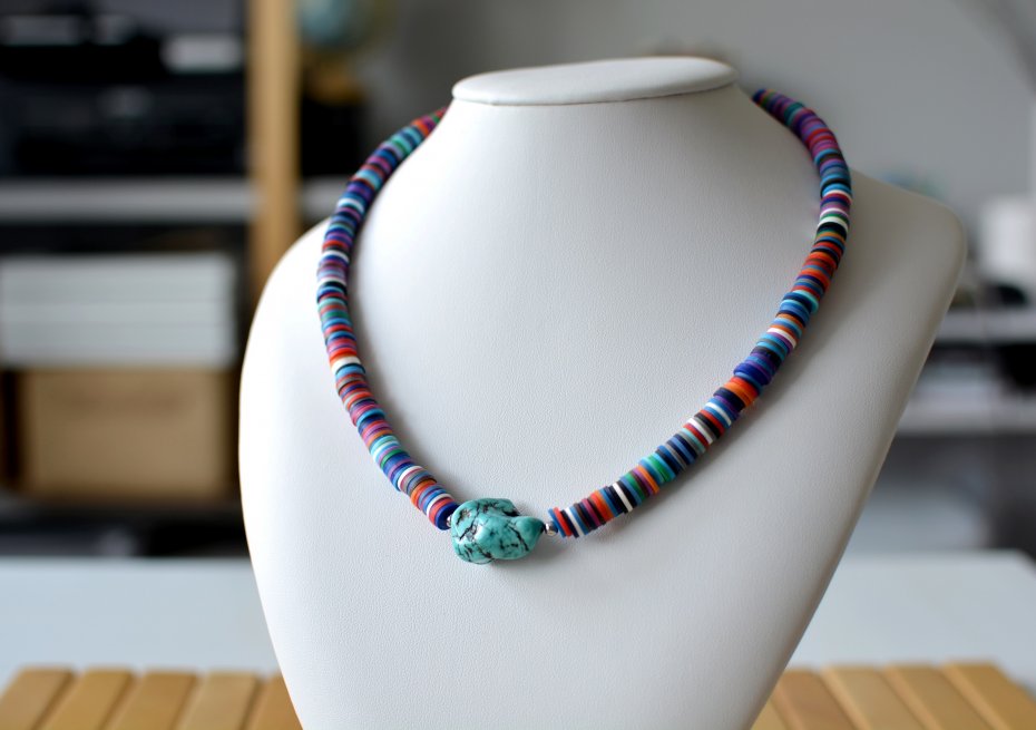 Naszyjnik wykonany z polimerowych koralików "katsuki" w postaci krążków (śr. 8mm) oraz z nieregularnej bryłki howlitu (wym. 24x22mm), a także kulek przekładkowych ze stali szlachetnej. Naszyjnik został wykończony również elementami metalowymi ze stali szlachetnej. Ma on długość ok. 44cm (+ dodatkowo 5cm łańcuszka przedłużkowego, który standardowo montujemy przy zapięciu). Zapinany jest na karabińczyk.