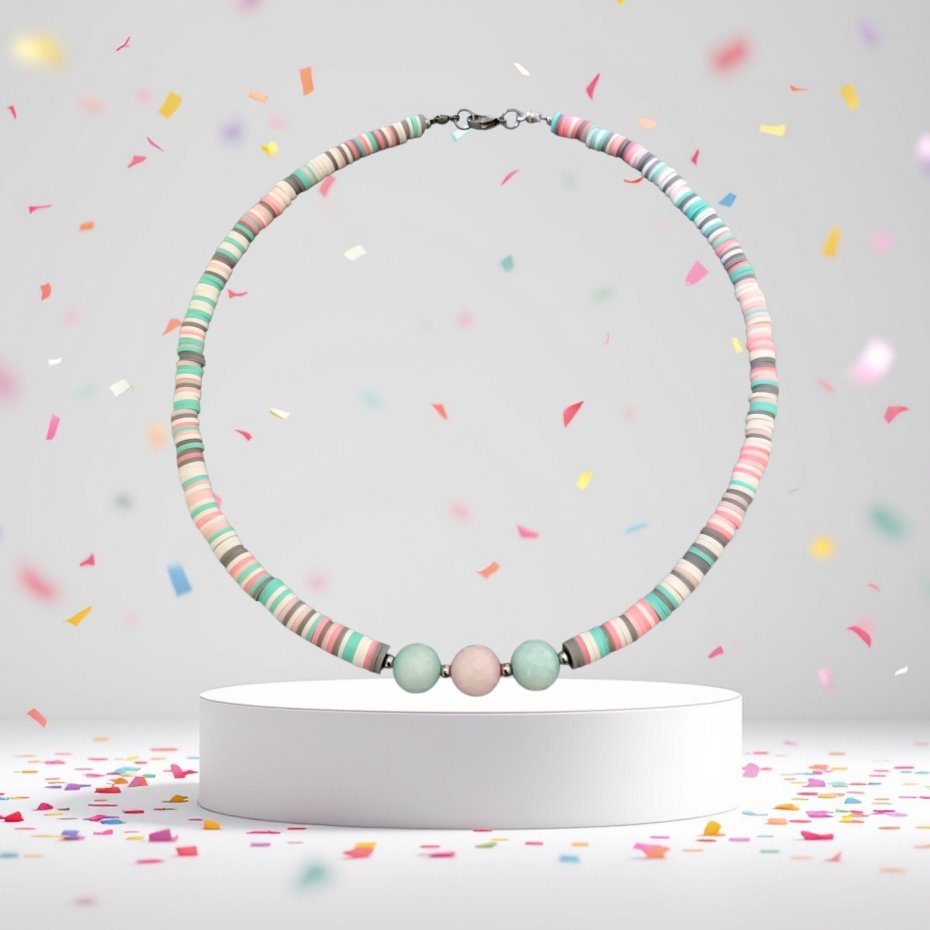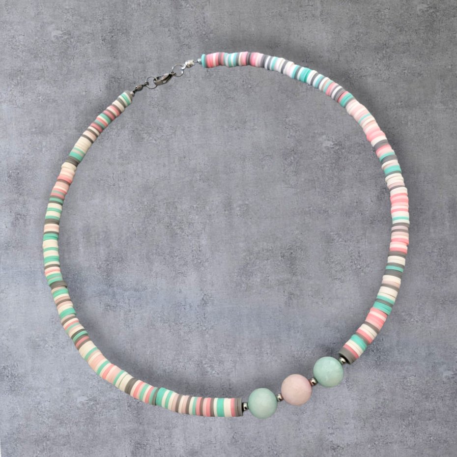 Naszyjnik wykonany z polimerowych koralików "katsuki" w postaci krążków oraz z fasetowanych kulek jadeitu (śr. 10mm), a także kulek przekładkowych ze stali szlachetnej. Naszyjnik został wykończony również elementami metalowymi ze stali szlachetnej. Ma on długość ok. 46cm (+ dodatkowo 5cm łańcuszka przedłużkowego, który standardowo montujemy przy zapięciu). Zapinany jest na karabińczyk.