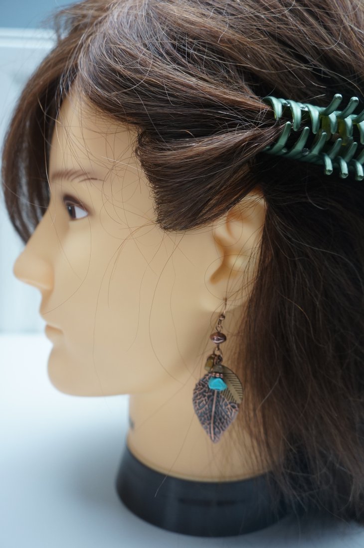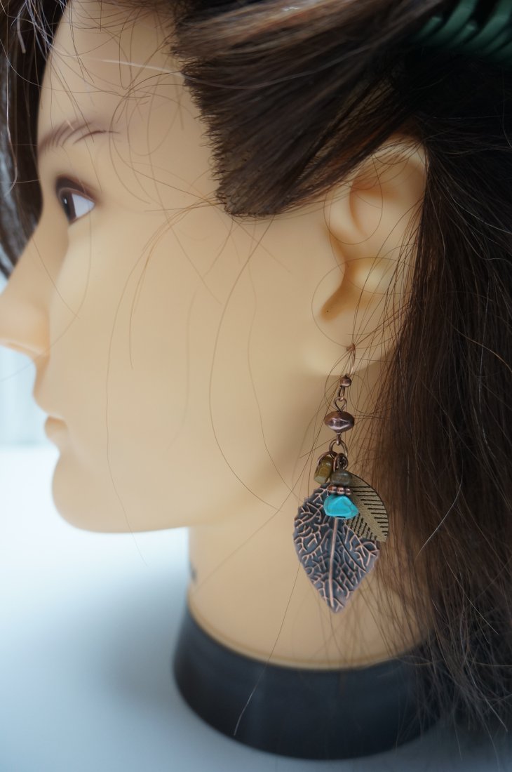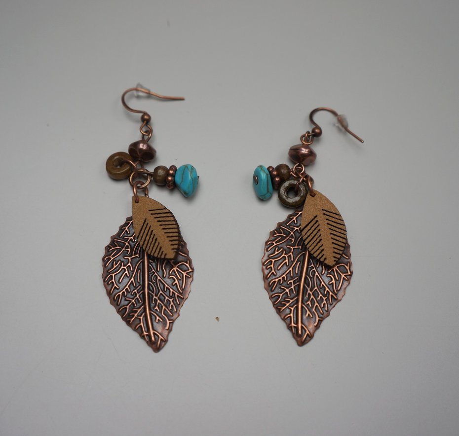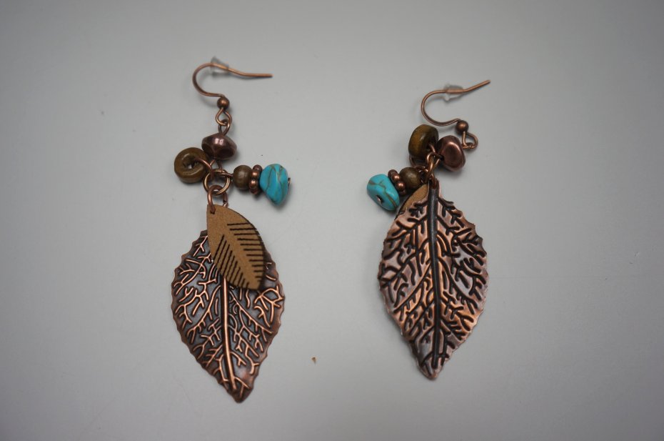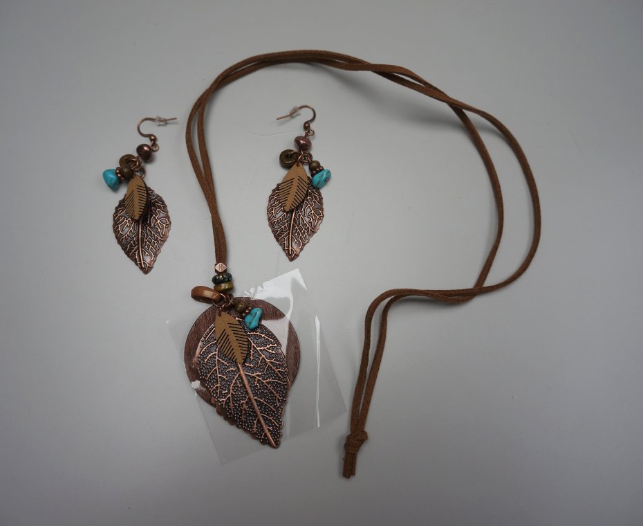 3-częściowy zestaw: naszyjnik i kolczyki z wisiorkiem w kształcie liścia. Styl vintage. Wykonane z drewna i metalu. Wisiorek zawieszony na rzemieniu. Kolczyki na otwarty bigiel. Komplet uniwersalny do codziennego noszenia i wakacji. Stan bardzo dobry.