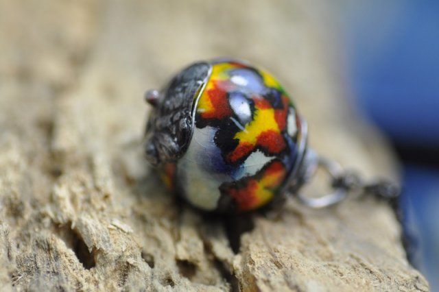 Oferuję autorski naszyjnik ceramiczny składający się z wisiora - kuli , oraz mocnego, oksydowanego, antyalergicznego łańcuszka dł. 80cm. Kulę ceramiczną po uformowaniu i spektakularnym szkliwieniu kilkukrotnie wypalałam w wysokiej temperaturze, po czym ubrałam w oprawę metodą Tiffany`ego. Pokryłam patyną i antyutleniaczem.