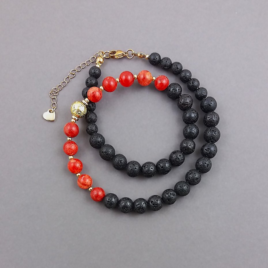 Podwójny naszyjnik z kulek czarnej lawy i korala bambusowego w niejednorodnym kolorze czerwieni, oranżu i brązu.