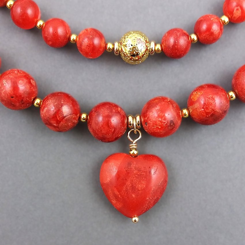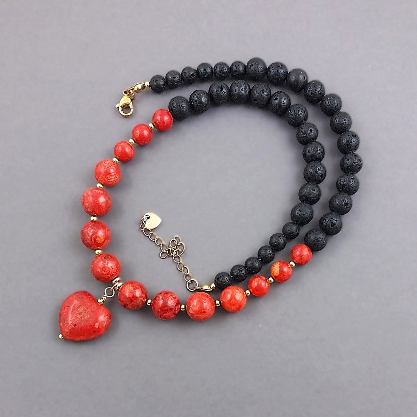 W drugim, dłuższym kamienie mają średnicę 8 i 6mm (lawa) i 11,10 i 8mm (koral). Tu centralnie umieściłam zawieszkę w kształcie serca z korala, o wymiarach 2x2cm.