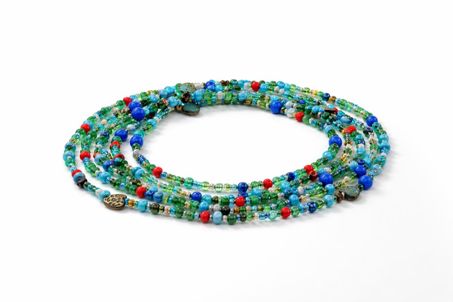 Odkryj magię kolorów z dwusznurkowym naszyjnikiem z koralików. Ta długa, efektowna biżuteria bez zapięcia to idealny wybór dla kobiet ceniących oryginalny styl. Koraliki w odcieniach niebieskiego, zielonego, czerwonego tworzą tętniącą życiem kompozycję, a finezyjne hematytowe serduszka dodają jej charakteru. Przełóż przez głowę i ciesz się wyjątkowym dodatkiem do każdej stylizacji - od codziennego jeansu po luźny styl etno. Wykonany z myślą o komforcie i wyjątkowym wyglądzie.