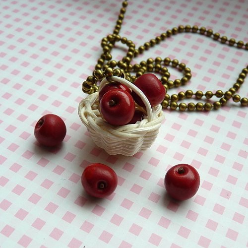 Uroczy naszyjnik z miniaturowym koszyczkiem pełnym dojrzałych jabłuszek:) wymiary koszyczka: 2,5cm x 2cm, długość kulkowego łańcuszka: 60cm. Wysyłam ozdobnie zapakowany;)