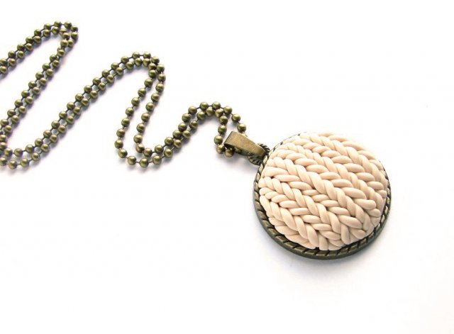 Oryginalny naszyjnik z dużą 3,5 cm zawieszka przypominającą fakturę sweterka w kolorze kremowym wykonaną ręcznie z masy termoutwardzalnej fimo. Długość łańcuszka: 75 cm