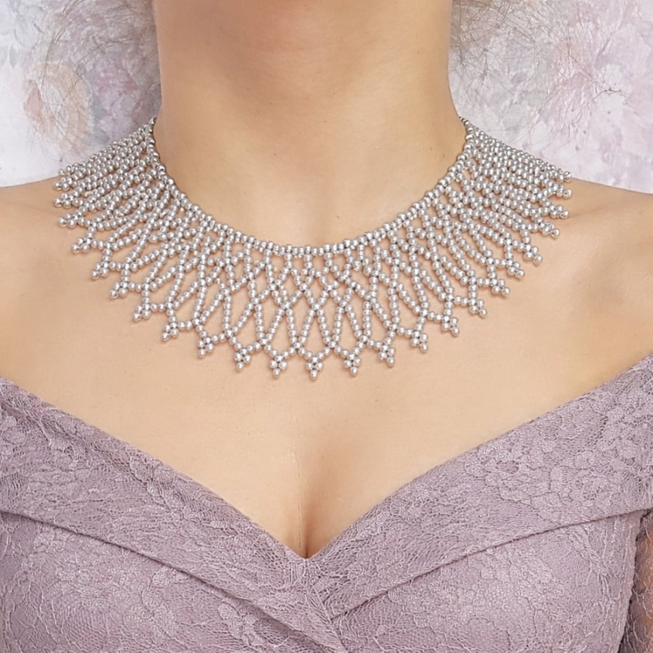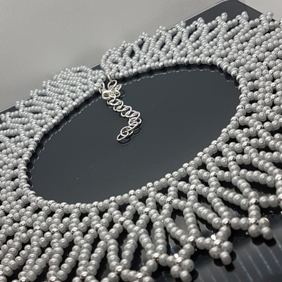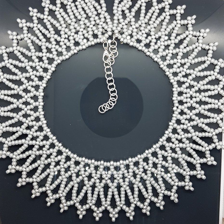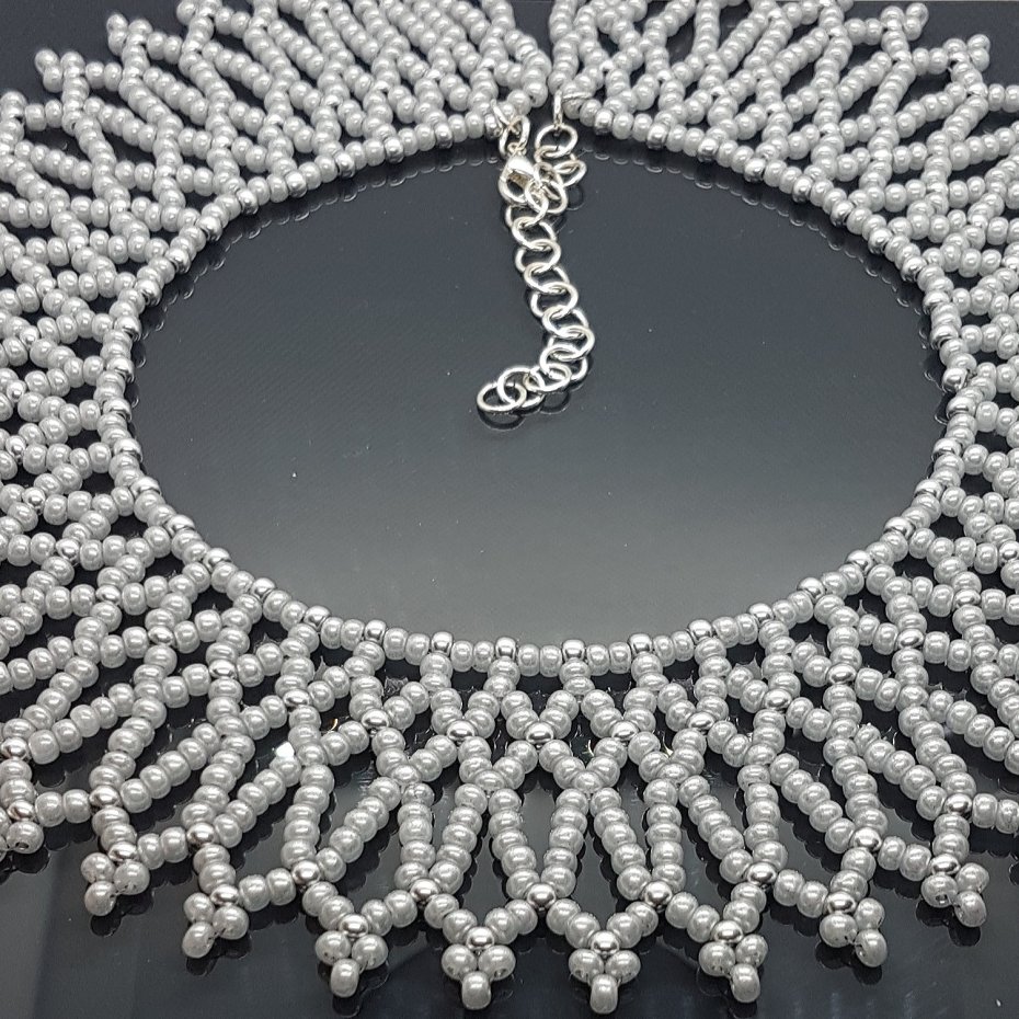Ten zjawiskowy naszyjnik typu Krywulka, z misternie tkanym geometrycznym, koronkowym wzorem, wykonano z najwyższej jakości czeskich koralików seed beads renomowanej marki Preciosa. Kompozycja subtelnych szarych koralików perłowych i błyszczących srebrnych koralików metalizowanych zachwyca precyzją i trwałym blaskiem.