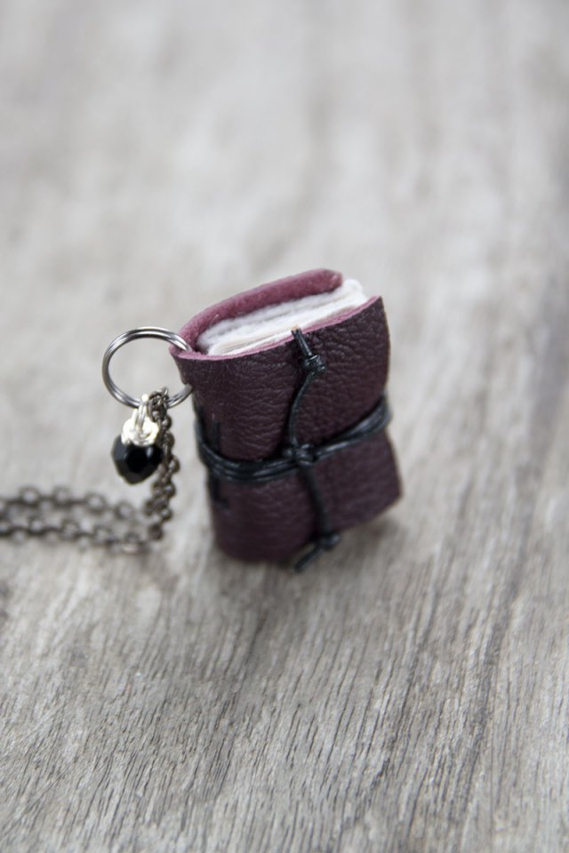 Naszyjnik ma skórzaną okładkę, a w środku ręcznie szyte kartki z papieru.