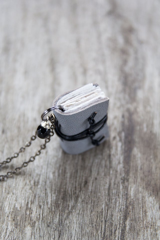 Naszyjnik ma skórzaną okładkę, a w środku ręcznie szyte kartki z papieru.