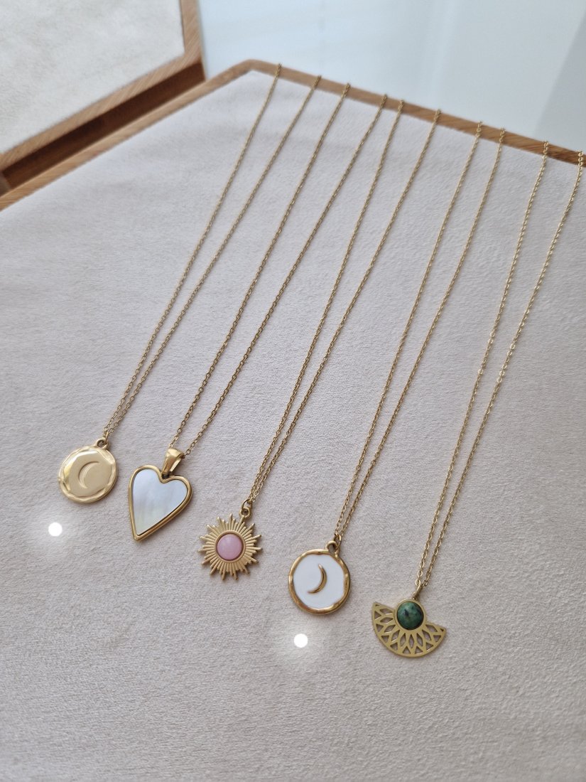 Naszyjnik o nieregularnym kształcie z symbolem księżyca, z tłem emaliowanym na biało. Rewers zawieszki cały złoty z tłoczonym księżycem, dzięki czemu można go nosić na dwa sposoby.