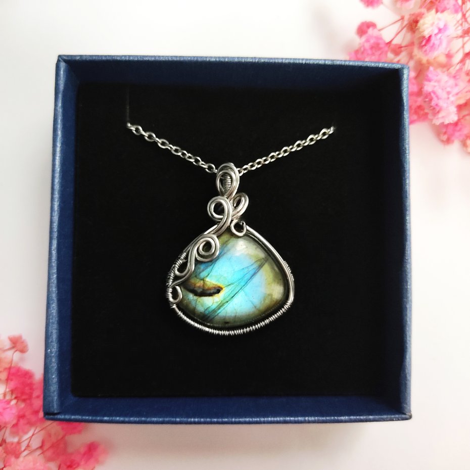 Naszyjnik z labradorytem został wykonany z dbałością o każdy szczegół metodą wire wrapping, przy użyciu trwałej i hipoalergicznej stali chirurgicznej. Kamień zachwyca intensywną iryzacją – przy zmianie kąta światła pojawiają się odcienie błękitu, niebieskego i złota, które sprawiają, że biżuteria wygląda jak małe dzieło sztuki. Subtelne, ręcznie formowane sploty otulają labradoryt niczym ramę obrazu, podkreślając jego naturalne piękno i niepowtarzalność każdego egzemplarza.