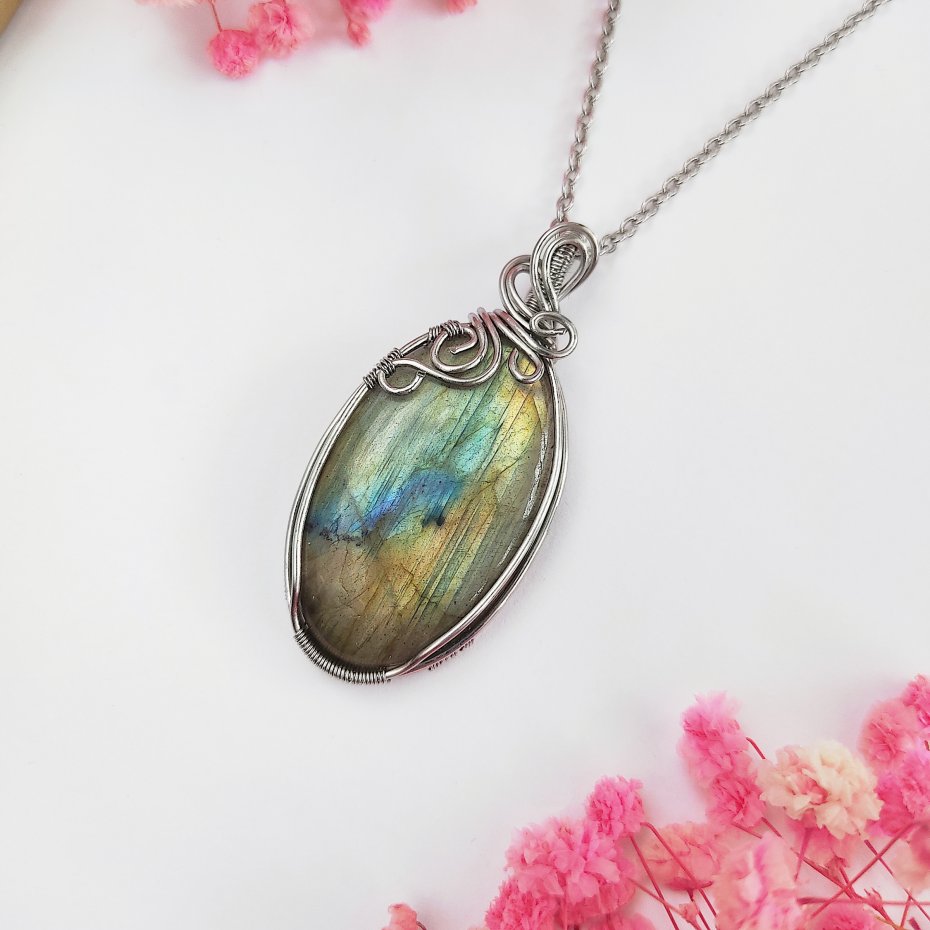 Naszyjnik Labradoryt Owal ręcznie wykonany z drutów ze stali chirurgicznej metodą wire wrapping.