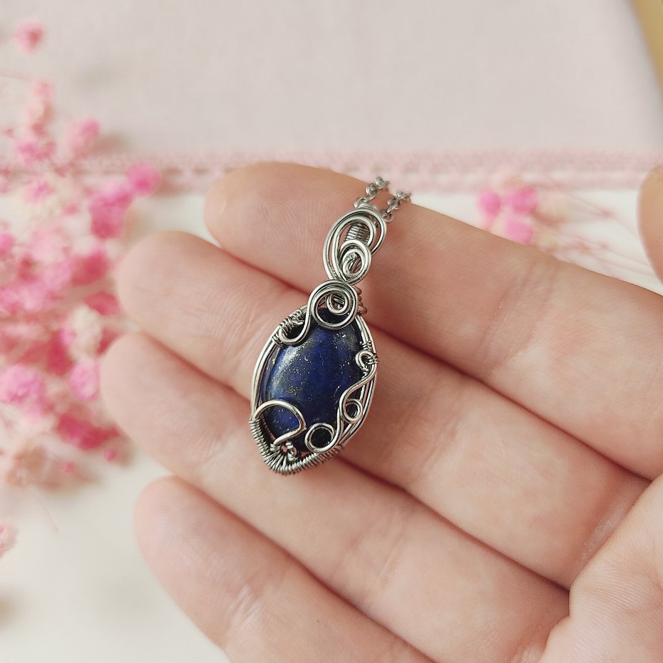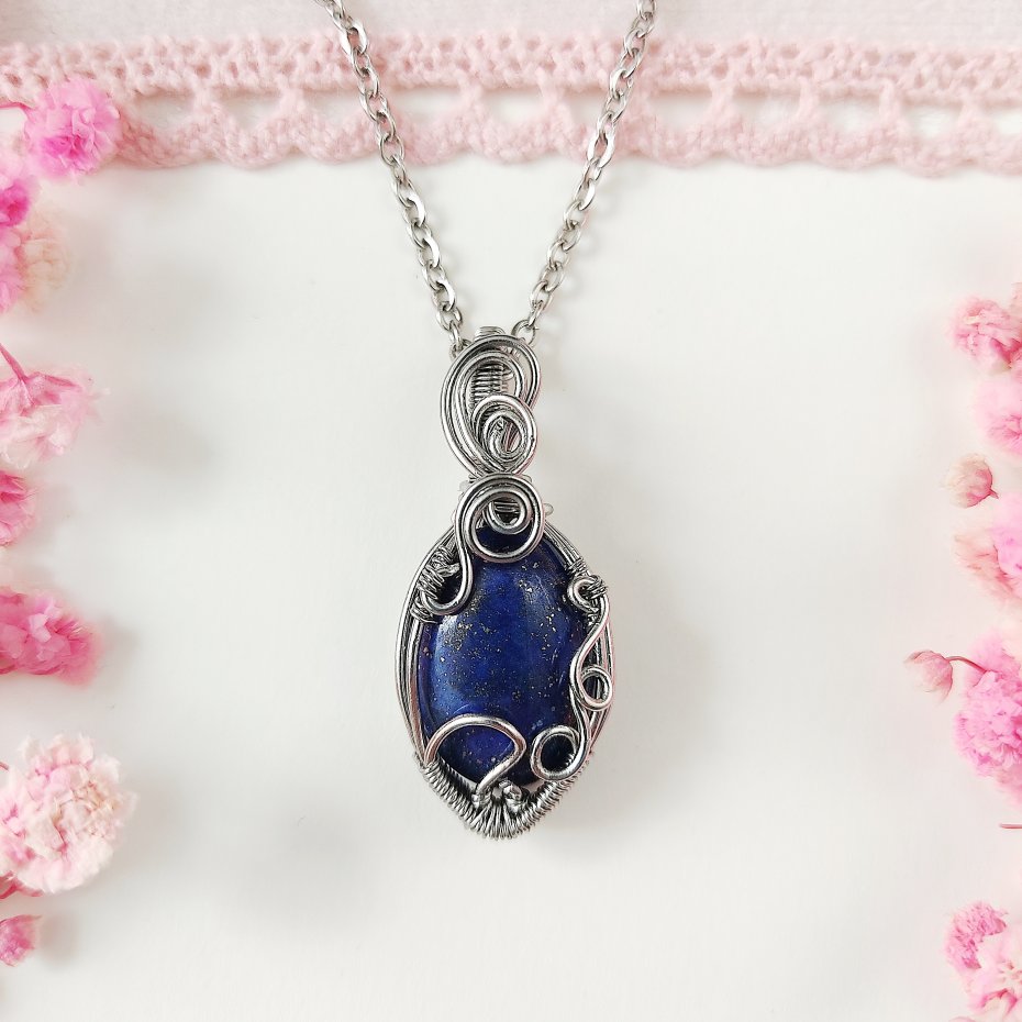 Naszyjnik z Lapis Lazuli wykonany metodą wire wrapping to wyjątkowy dodatek. Naturalny kamień o głębokim, niebieskim kolorze zdobi delikatnie oplataną, misterną oprawę ze stali chirurgicznej. Biżuteria stworzona z myślą o osobach, które cenią sobie mistyczne inspiracje, unikalne wzory i symboliczne znaczenie kamieni naturalnych.