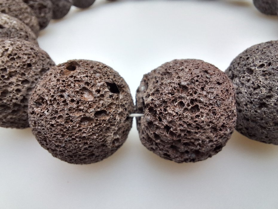 Duże kule lawy wulkanicznej w kolorze czarnym. Średnica około 2,5 cm.