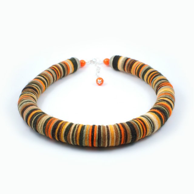 Naszyjnik w całości wykonany ręcznie z filcu . Filcowe kółeczka nawleczone na żyłkę jubilerską tworzą kompozycję barwną : bazowym kolorem jest beż+brąz w kilku odcieniach, zestawiony z odcieniami oranżu, ciemnej oliwki, ecru . Kolory ułożone w sposób nieregularny tworzą energetyzującą, ciepłą , unikalną, kompozycję. Średnica naszyjnika wynosi 2,5 cm, jest lekki, bardzo strojny, zakończony półkulą drewnianą barwną . Zapięcie : karabińczyk w kolorze srebrnym na łańcuszku aluminiowym, zakończonym koralikiem dobranym kolorystycznie.