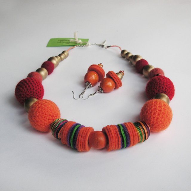 Naszyjnik wykonany z kul drewnianych i filcowych, w tym ręcznie oplecionych na szydełku bawełnianą przędzą oraz z elementów filcowych w kształcie walca, składającego się z wielu krążków , w odpowiednio dobranych odcieniach. Naszyjnik jest nawleczony na woskowany sznurek jubilerski w kolorze pomarańczowym. Obwód naszyjnika to ok. 62 cm. Kolory występujące w naszyjniku to : ostry pomarańcz, czerwony , fiolet, zielony z kilkoma kulami drewnianymi w kolorze złoty mat . Każdy naszyjnik z mojej kolekcji Madame to unikat, nie ma drugiego takiego samego.