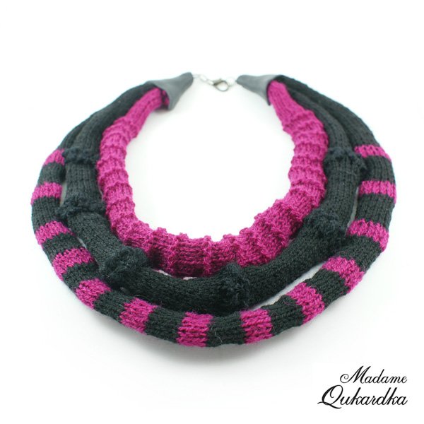bardzo lekki potrójny naszyjnik wełniany, kolory to ostry amarant fuksja łączony z czarnym, w całości wykonany ręcznie na drutach