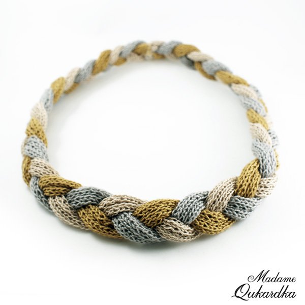 Mięciutki naszyjnik dzianinowy w 3D o długości ca. 70cm , ręcznie robiony na drutach , kolory: miodowy, beż i szary.