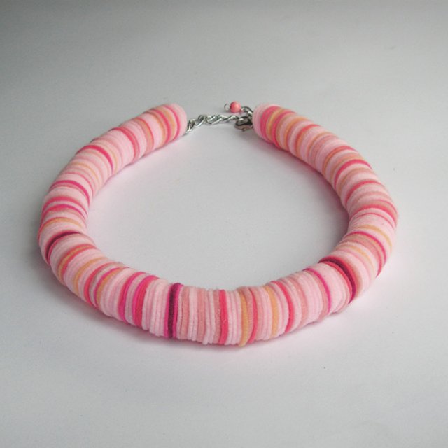 Naszyjnik w całości wykonany ręcznie z filcu. Filcowe kółeczka nawleczone na żyłkę jubilerską tworzą kompozycję barwną: różne odcienie różu przemiennie z odcieniami koloru łososiowego, morelowego, a także intensywnych odcieni różowego.