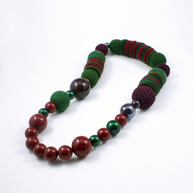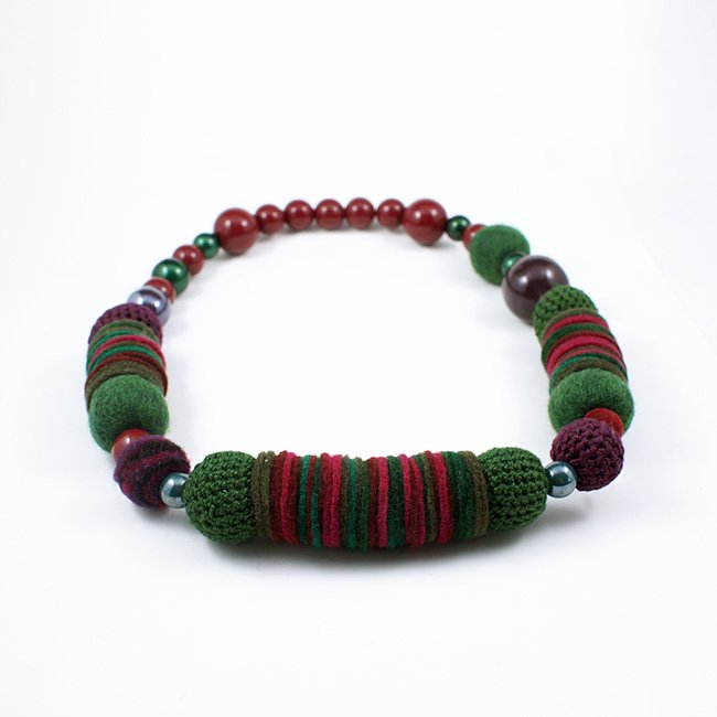 Naszyjnik wykonany z kul filcowych, ceramicznych, drewnianych, akrylowych, w tym ręcznie oplecionych na szydełku bawełnianą przędzą oraz z elementów filcowych w kształcie walca, składającego się z wielu krążków , w odpowiednio dobranych odcieniach. Naszyjnik jest nawleczony na gumę, bez zapięcia, zakłada się go przez głowę. Obwód naszyjnika to ok. 61cm. Kolory występujące w naszyjniku to : bordo, , oberżyna, zieleń butelkowa trochę oliwkowej zieleni, akcent fuksji i czerwieni ...