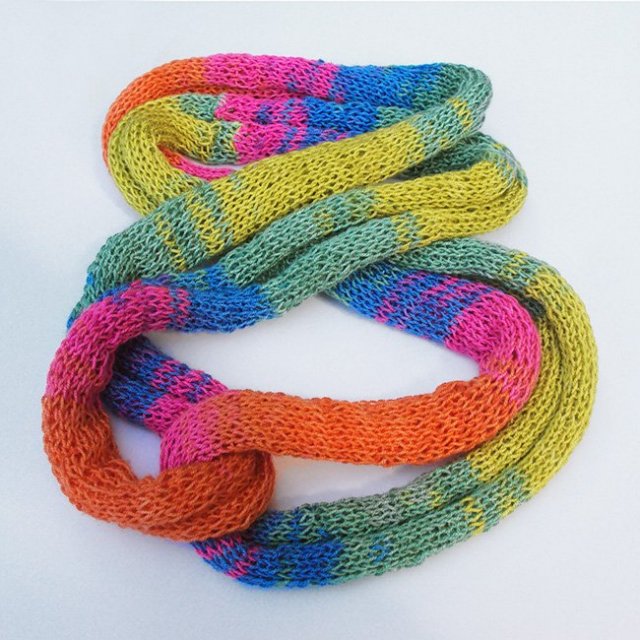 Kolorowy naszyjnik w formie pętli , wykonany w całości na drutach z cieniowanej, cieniutkiej włóczki - 100% bawełna. Całość ma w obwodzie ca 1,85 m i pozwala na wiele sposobów noszenia - na szyi można go zamotać kilkakrotnie , ciaśniej lub luźniej, jak kto woli albo jako szaliczek można go nosić także na ręku jako bransoleta.