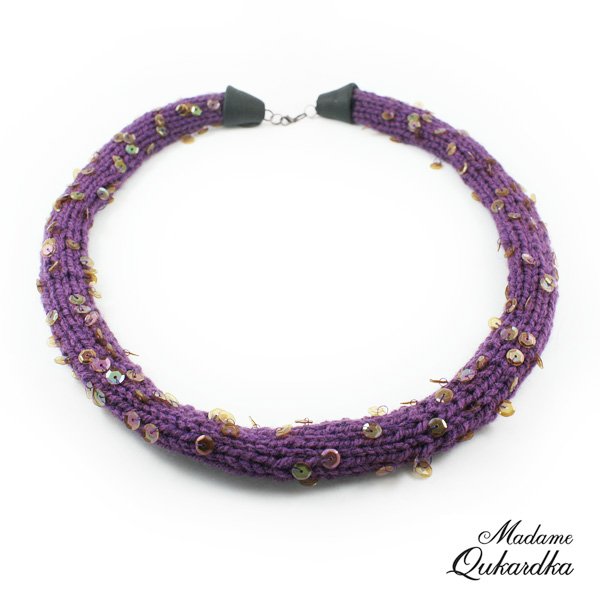 bardzo lekki naszyjnik w całości wykonany ręcznie na drutach , w kolorze fioletowym, w dzianinę wplecione są opalizujące cekiny,