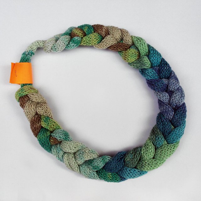 Naszyjnik wykonany w całości ręcznie na drutach z cieniutkiej bawełnianej przędzy, cieniowanej, a następnie zapleciony w łańcuch - warkocz, co daje ciekawy efekt plastyczny i kolorystyczny.
